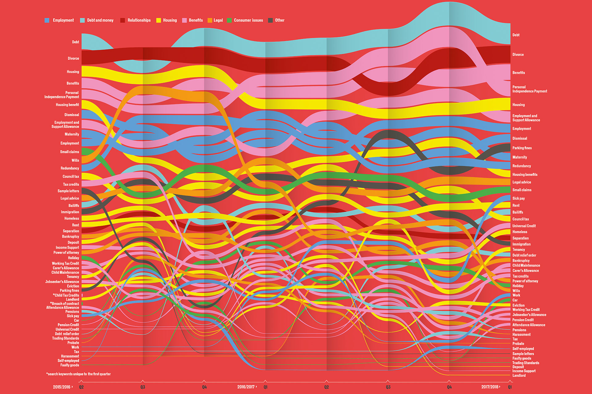 WIRED shared a visualization showing what people in the UK were worried about throughout the 2017 year. The chart is based on data about popular search queries at the Citizens Advice website. Take a look at its high-resolution version.
