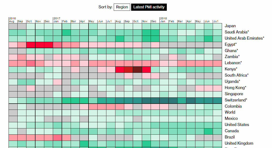 Bloomberg visualized the changes in the Purchasing Managers’ Index (PMI) activity by country between August 2016 and July 2018. Here you’ll find a heat map chart, partially pictured above. It can be sorted by region or by the latest PMI activity. For another look, don’t miss out on a map at the beginning of the article.