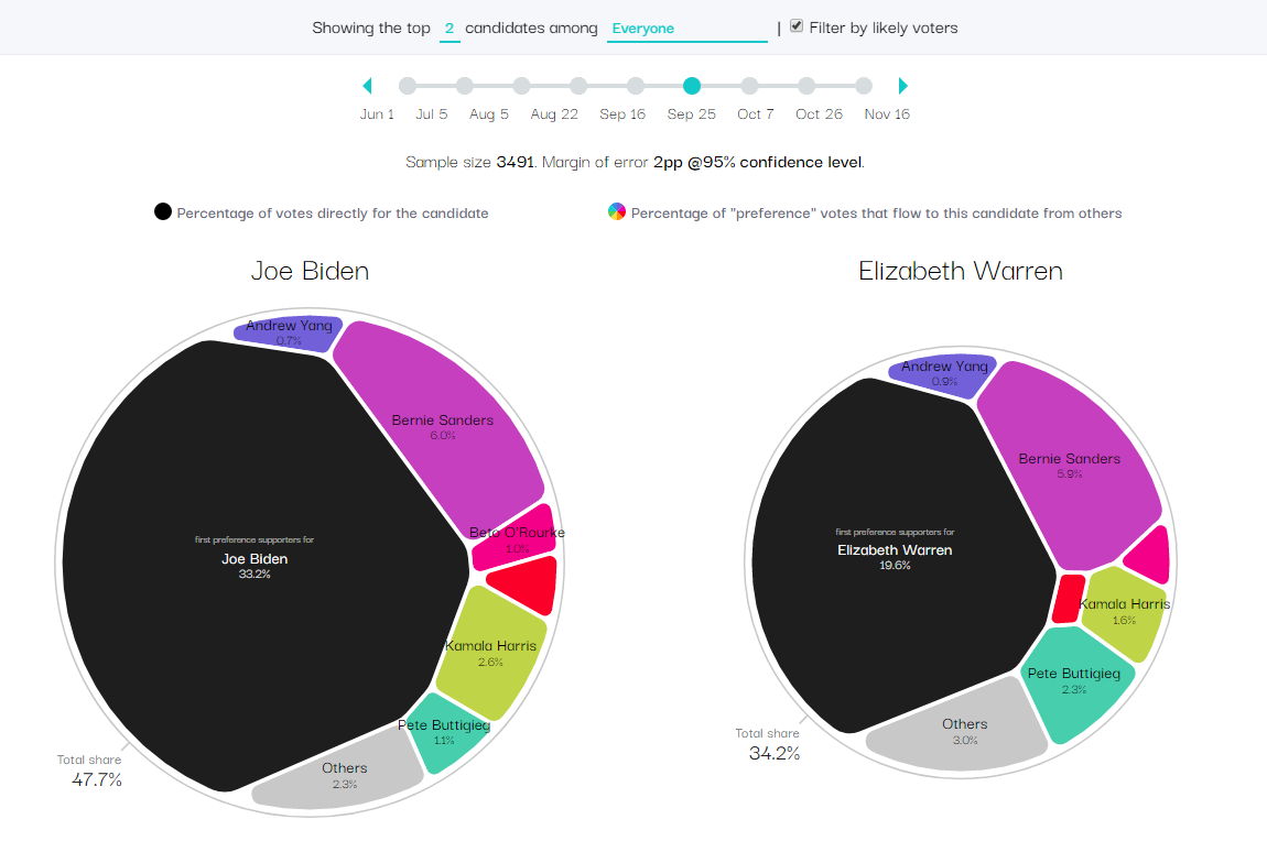 Swayable, a data science platform measuring how media content campaigns impact public opinion, decided to use their tools to go deeper with pre-election polls than the standard horse-race model would usually offer when it comes to (crowded) primaries. So they organized mass digital ranked-choice polling on thousands of respondents every few weeks between the beginning of June 2019 through the middle of November 2019. Then they analyzed the collected data and presented some of the results in fascinating charts with the help of a prototype created for Swayable by Nadieh Bremer, a well-known data visualization designer.