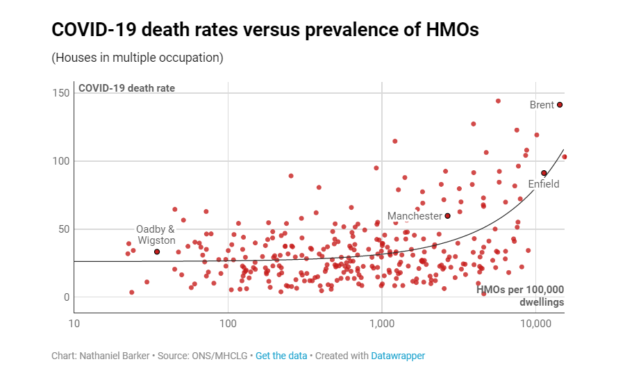 In three scatter charts and one column chart, Nathaniel Barker compares COVID-19 death rates against housing overcrowding, prevalence of houses in multiple occupation (HMOs), homelessness, and social housing shortage across local authorities in the U.K. Some correlations appear to be really stark. Take a look.