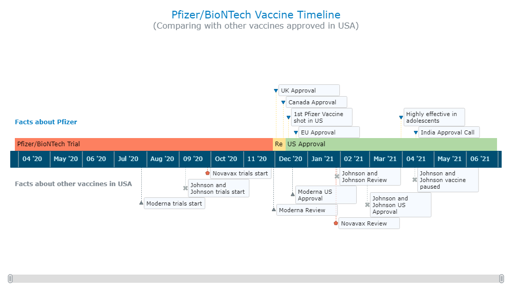- the temporal ranges above the timeline that indicates events related to the Pfizer-BioNTech vaccine in general as milestones, and