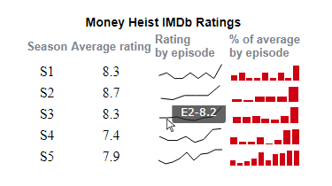 The line sparklines will display how the IMDb ratings of the episodes change over each of the five seasons of Money Heist.
