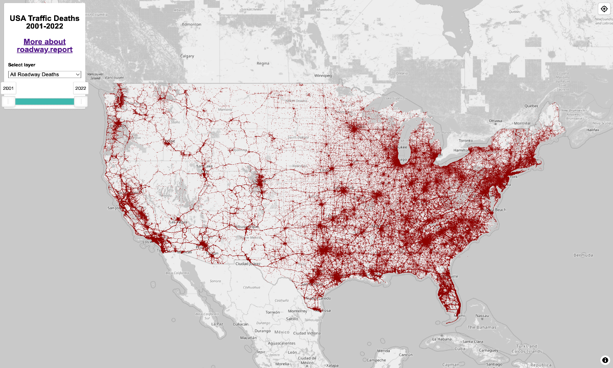 Ben Carneiro has utilized data from NHTSA’s Fatality Analysis Reporting System (FARS) to create an interactive dot map that chronicles road fatalities from 2001 to 2022 across the nation. The map allows you to adjust the timeframe to a single year or several years and filter results by types of victims, such as drivers/passengers or pedestrians/cyclists/others. A cautionary note in the description of the project states, “There are four unmapped deaths for every death on the map,” highlighting potential data gaps. Click on individual dots to access detailed public record data for each specific accident.