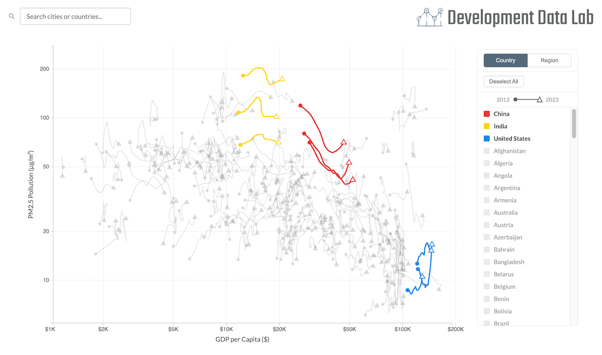 The Development Data Lab built a connected scatter plot that lets you explore how this has played out across the world’s largest cities, tracking the three largest per country from 2013 to 2023. City GDP per capita runs along the horizontal axis and PM2.5 air pollution along the vertical.
