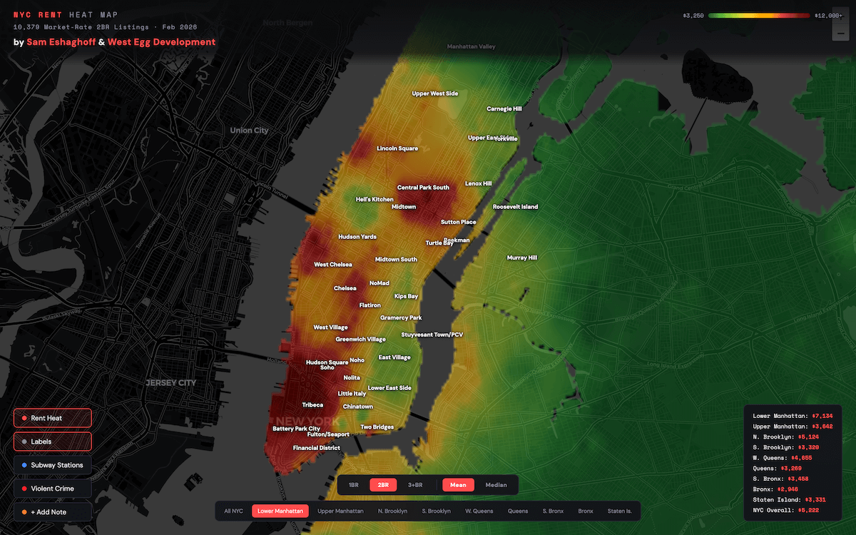 Sam Eshaghoff and West Egg Development visualized thousands of market-rate listings from StreetEasy as of February 2026 on a heat map. The map covers all five boroughs, with a continuous color gradient showing prices from the lowest to the most expensive areas. Hovering over any point on the map shows the estimated rent for that location. You can switch between one-bedroom, two-bedroom, and three-plus-bedroom listings, as well as between mean and median.