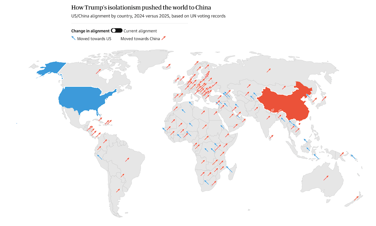The Guardian visualized findings from a Focaldata report analyzing UN General Assembly voting records to gauge where countries stand between the U.S. and China. The article opens with an interactive world map that toggles between two views: a proportional symbol map showing the direction of each country’s shift between 2024 and 2025 using arrows, and a choropleth map displaying current alignment.