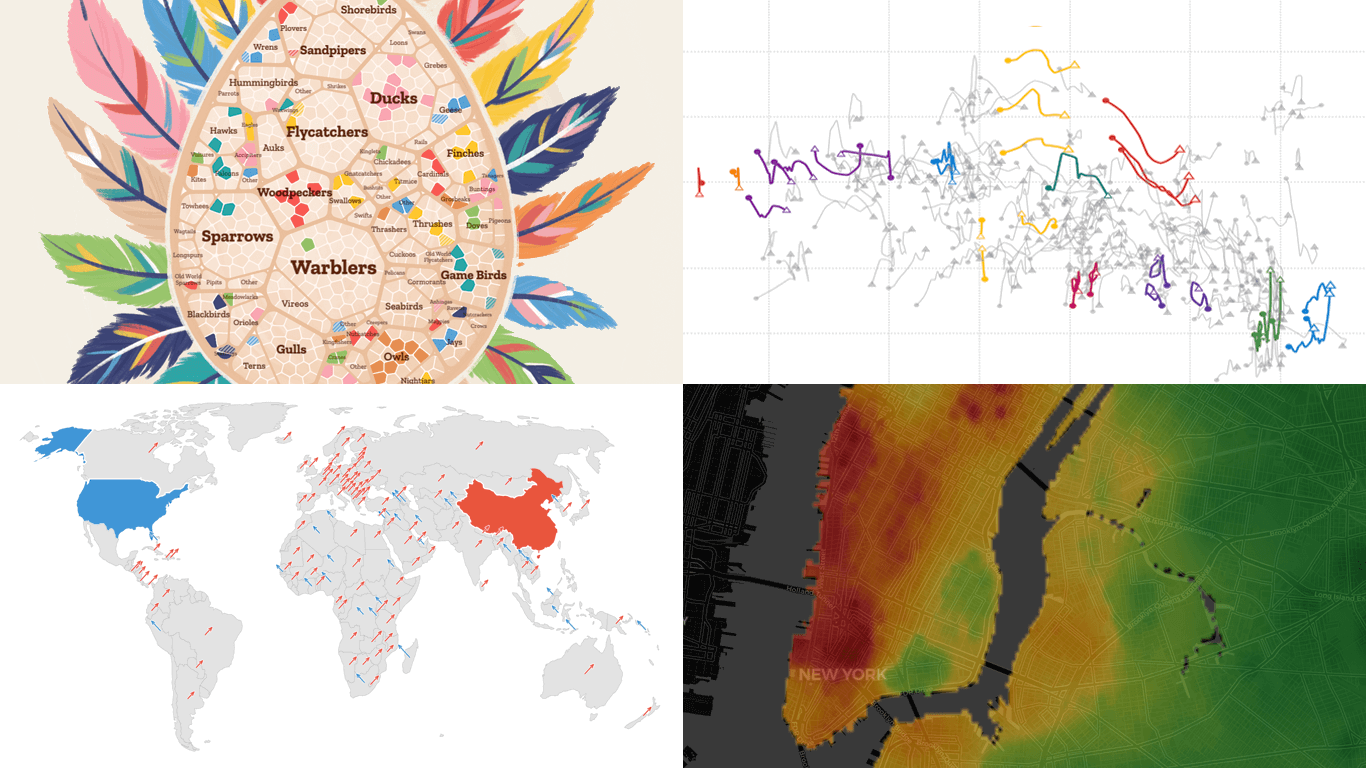 From bird searches and rent prices to world cities and geopolitics, this week’s picks cover a wide range of subjects. But all of them use thoughtful visualization to make complex data easier to take in and explore. We will be back next week with more great examples of charts and maps at work in DataViz Weekly.